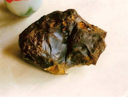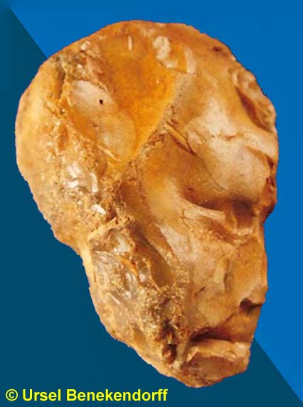 A black flint "glyphe" in abstraction presenting a gorilla depiction with very clear working traces all around. The facial part of this animal type is reduced to an elementary style with writing character and has a white circle on one side, here interpretated as moon symbolic. Since many types of ape depictions in a similar fashion were recovered at the same site, one can come to the conclusion, the depicted species were familiar to the sculptorer of that time. Compare also the following photo impression together with the ape-chapter of stoneage-art for more information.