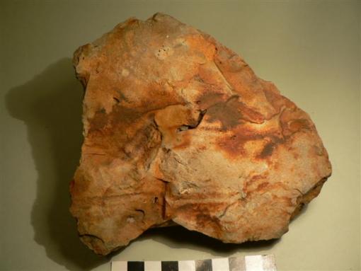 Silhouette of a horse with traces of paint, indicating at the neckline the head of a bear, has an open mouth and teeth are showing. At the centre there is bear cubs head with a small stone to be noticed, indicating the bears eye.