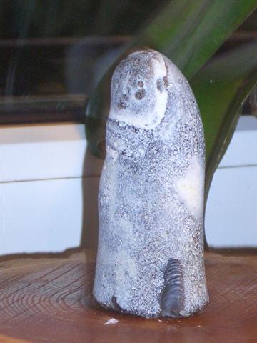 Not a convincing impression made this O W L in flint when sampled, but was "secured" by finds in different stone material, with identical shapes and traces of workmanship. (see above owl.)