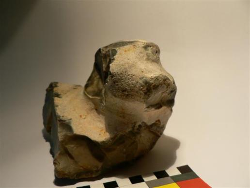 The groove left side to the mouth is a repeated mark on some of the hippo-sculptures from this site and can be observed on the quarzit find as well.